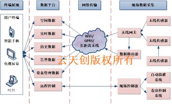One set of collection and transmission equipment (including routing node, long-distance wireless gateway node, Wi Fi wireless gateway, etc.) is deployed in each agricultural greenhouse park to cover all agricultural greenhouses in the whole park, transmitting sensor data and equipment control instruction data of each agricultural greenhouse in the park to interact with the platform server on the Internet.